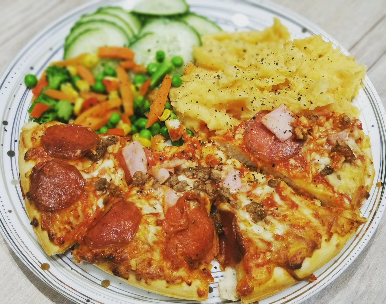 Take pizza for example, 4 slices from a well known take away company typically has around 850 calories which breaks down into the following macros: 40g protein, 88g carbs and 37g fat. My pizza (pictured) however is from a local supermarket and has only 393 calories (18g protein, 44g carbs and 15g fat). THAT’S LESS THAN HALF THE AMOUNT OF CALORIES THAN THE TAKEAWAY PIZZA!