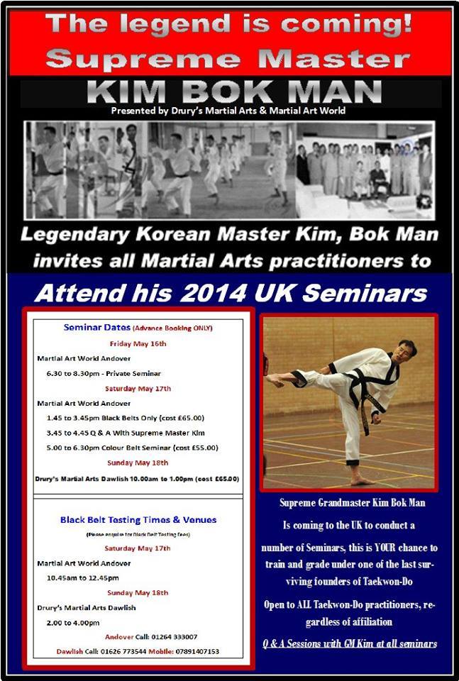 Here is the poster for Supreme Master Kim Bok Man’s UK seminars. I would strongly urge anyone wishing to train with a Taekwon-Do 1st generation legend to book your place now.